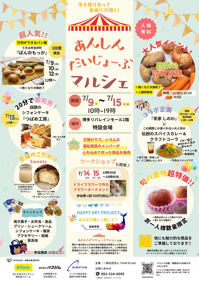 「あんしんだいじょーぶマルシェ」とは、福祉施設と民間企業をつなぐ今話題のプラットフォーム「gooddeeds」を運営する一般社団法人TEAM Di Jobが企画する販売会です。